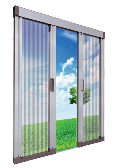 NYÍLÓ alumínium keretanyagú, elsősorban bejárati - erkélyajtókra felszerelhető rovarháló ajtó, rugós zsanérokkal, csappantyúval ellátott megoldás a rovarok ellen.